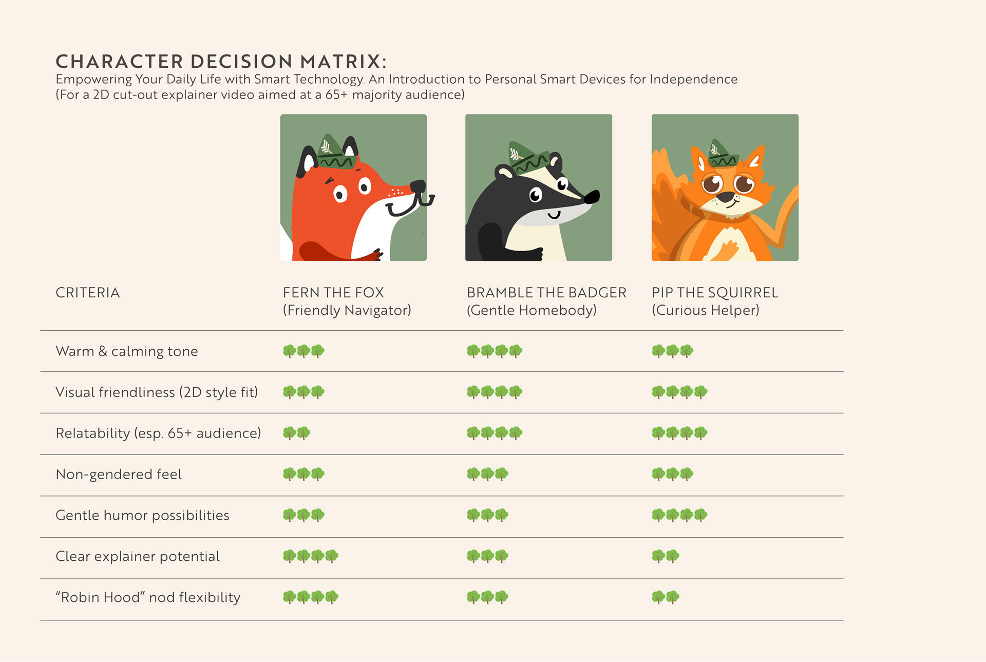A explainer video introducing smart home technology to a predominantly 65+ audience. The story is brought to life by a gentle woodland fox character, paired with a calm, approachable voiceover. Hand-drawn visuals, warm textures, and a friendly tone make technology accessible and relatable. We explored options to find the most suitable character.